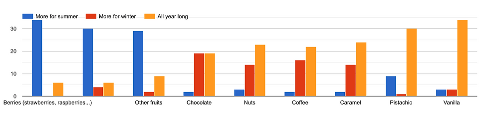 We have conducted a survey in order to understand the habit of ice-cream consumption of the French population. We wondered in which season do French people buy ice-creams, which brands they associate with which season, as well as which flavour.